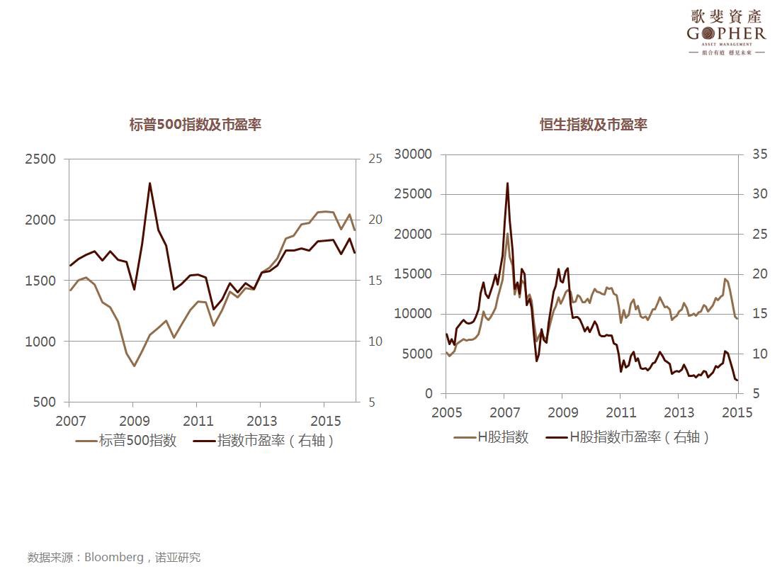 H 股指數(shù)的市盈率約6.7倍(2015年9月末),與過去5年(約9.1倍)和過去10年(約12.8倍)的平均相比處于低位,甚至低于2008年金融危機(jī)時(shí)的水平,反映了市場對中國經(jīng)濟(jì)前景的擔(dān)憂,其中還包括人民幣進(jìn)一步貶值的可能性。